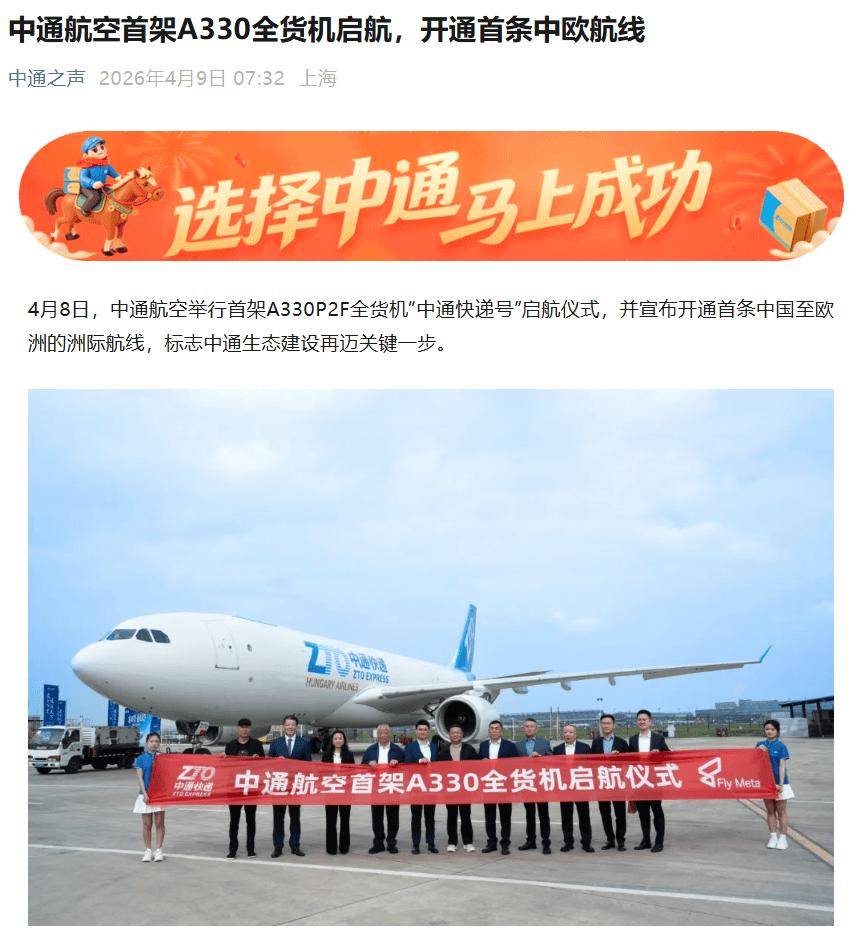 据“中通之声”官方消息,4 月 8 日,中通航空举行首架 A330P2F 全货机“中通快递号”启航仪式,并宣布开通首条中国至欧洲的洲际航线。